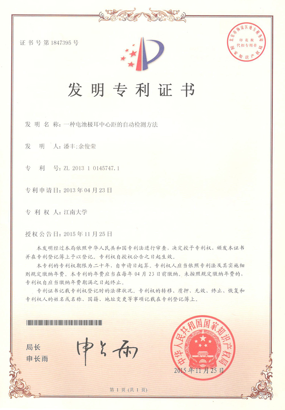 一种电池极耳中心距的自动检测方法专利证书