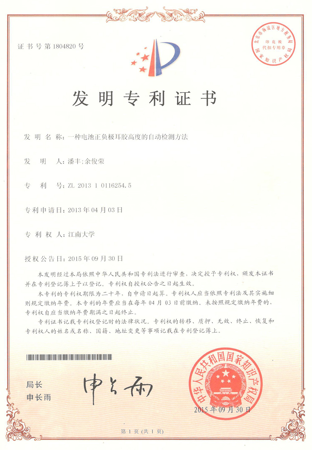 一种电池正负极耳端子长度的自动检测方法专利证书