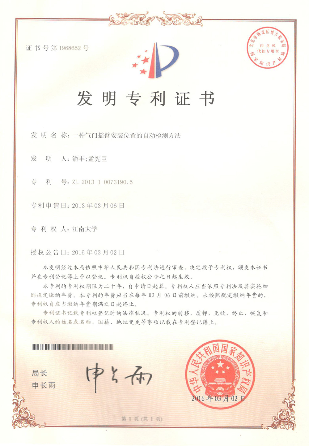 一种气门摇臂安装位置的自动检测方法专利证书