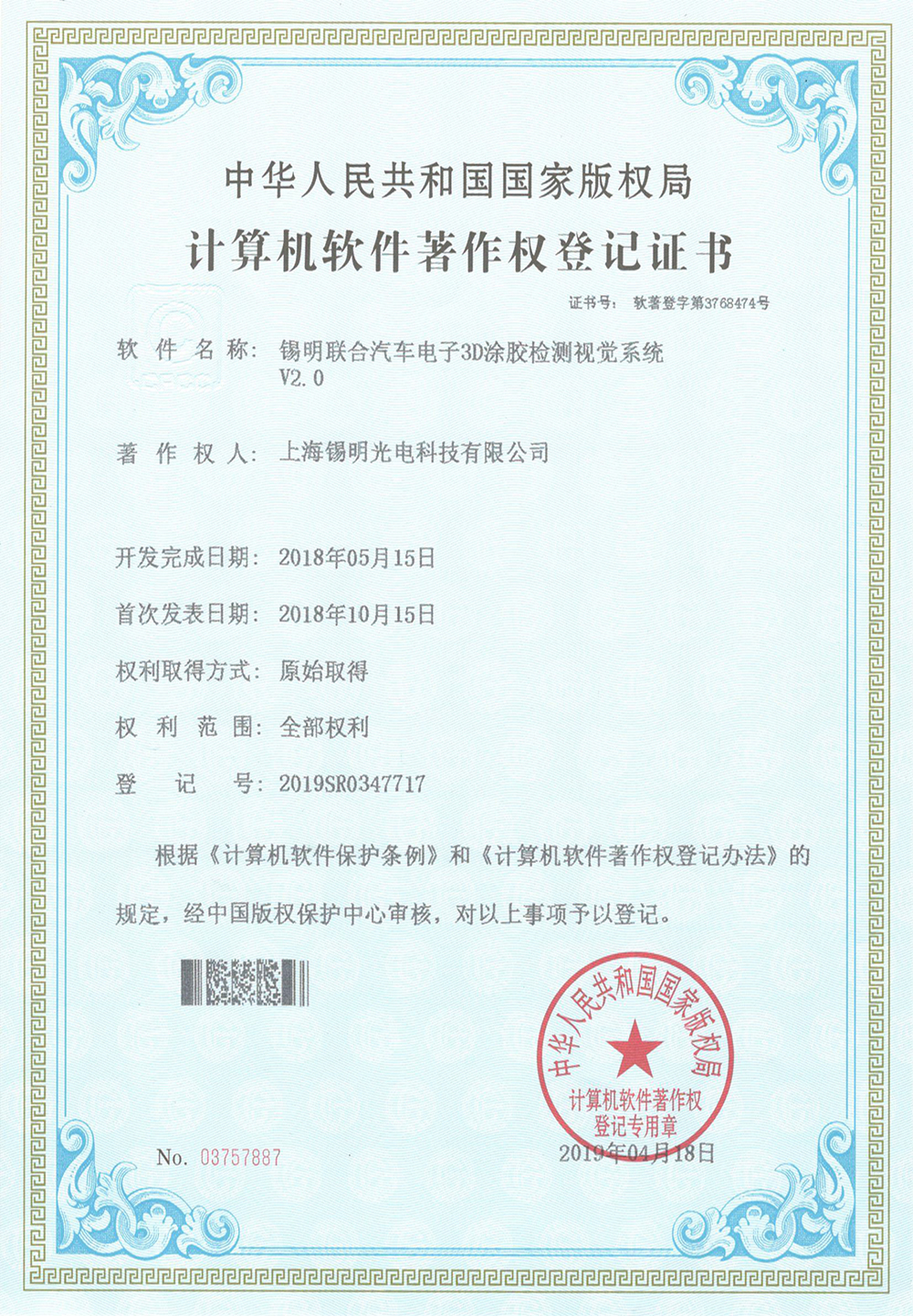 锡明联合汽车电子3D涂胶检测视觉系统V2.0